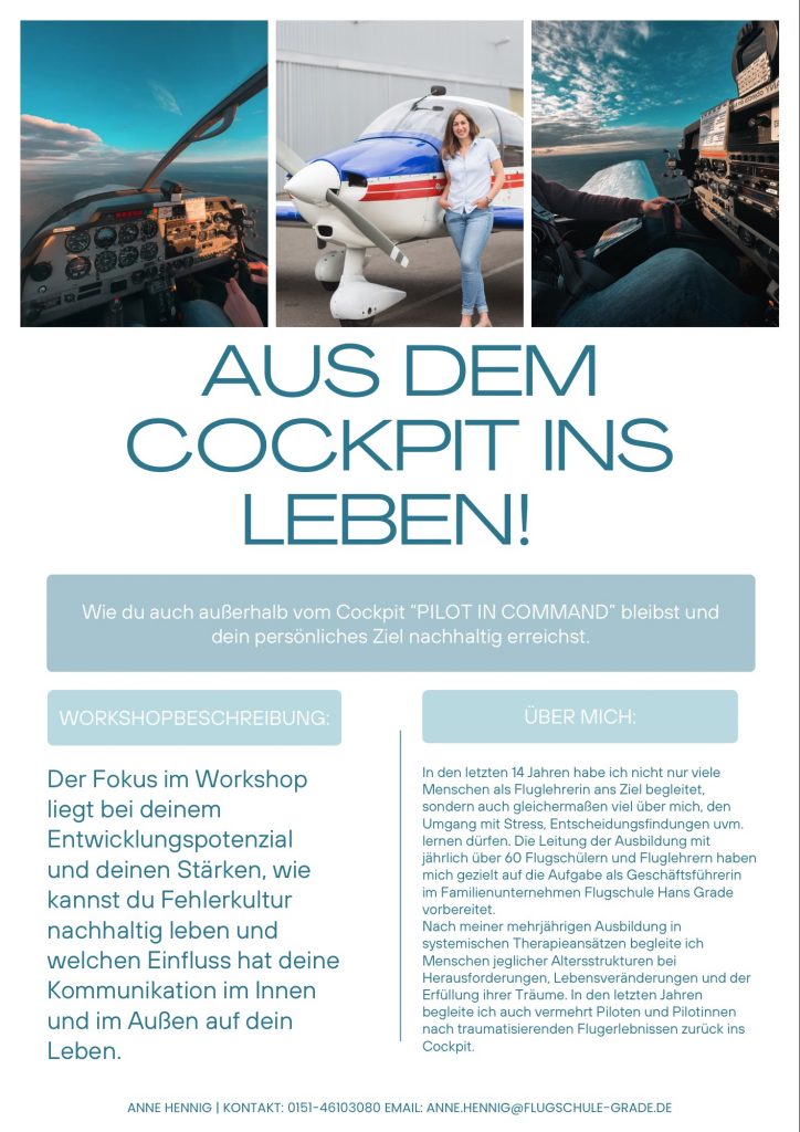 Aus dem Cockpit ins Leben! Der Fokus im Workshop liegt bei deinem Entwicklungspotenzial und deinen Stärken, wie kannst du Fehlerkultur nachhaltig leben und welchen Einfluss hat deine Kommunikation im Innen und im Außen auf dein Leben.
