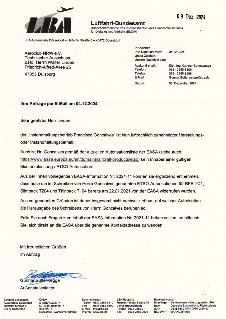 Gemäß Schreiben des LBA vom 06.12.2024 ist die Firma Francisco Concalves kein luftrechtlich genehmigter Herstellungs- oder Instandhaltungsbetrieb. Von Herrn Concalves bezüglich einiger Rettungsfallschirme herausgegebene Schreiben erfolgten laut LBA ohne Autorisation. „Nach unserem Kenntnisstand verfügt Herr Concalves derzeit nicht über eine Berechtigung als DAeC-Rettungsfallschirmprüfer.“
