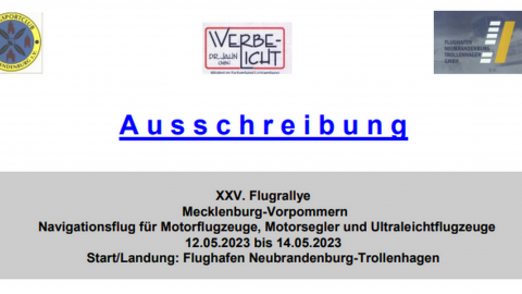 Vom 12.5. bis zum 14.5.2023 findet auf dem Flughafen Neubrandenburg-Trollenhagen des Flugsportclubs Neubrandenburg e.V. (FSC) die 25. Flugrally statt. Es…