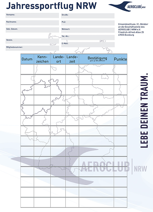 Diese Wertungskarte ist einzureichen in der Geschäftsstelle des AEROCLUB | NRW e.V., Friedrich-Alfred-Straße 25, 47055 Duisburg. Einsendeschluss ist der 31. Oktober des jeweiligen Wettbewerbsjahres.